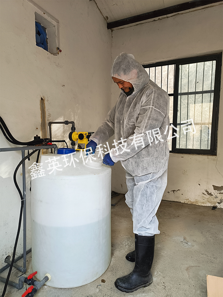 工作人員檢查水箱、添加凈水藥劑